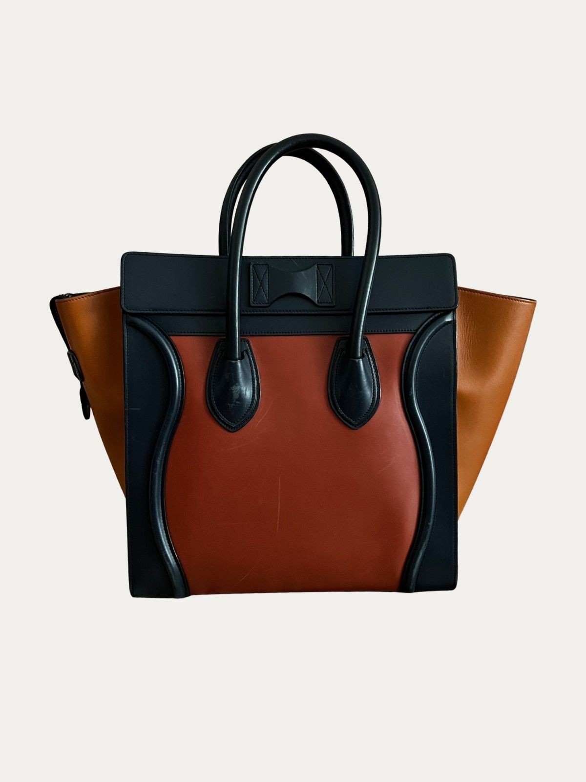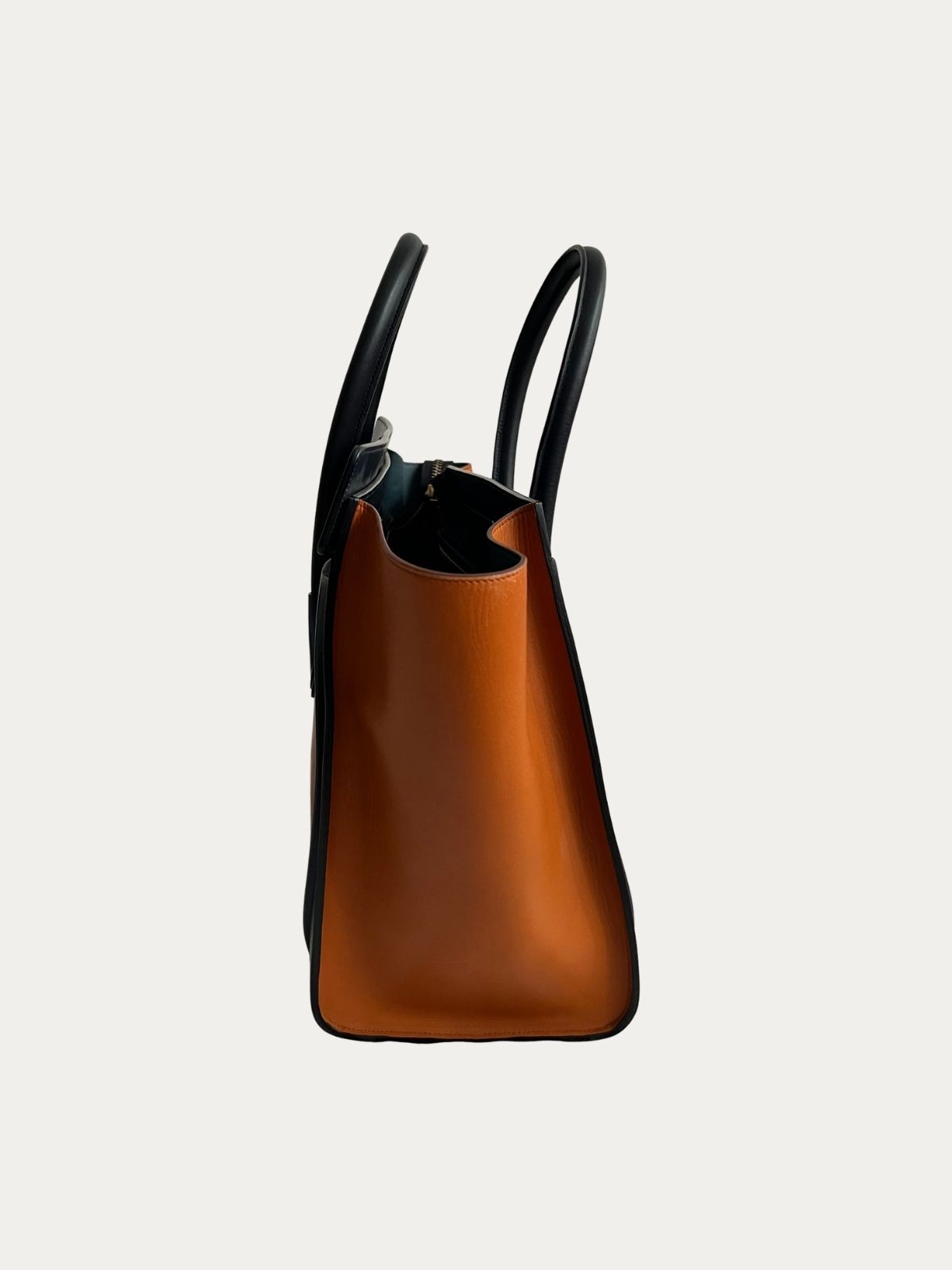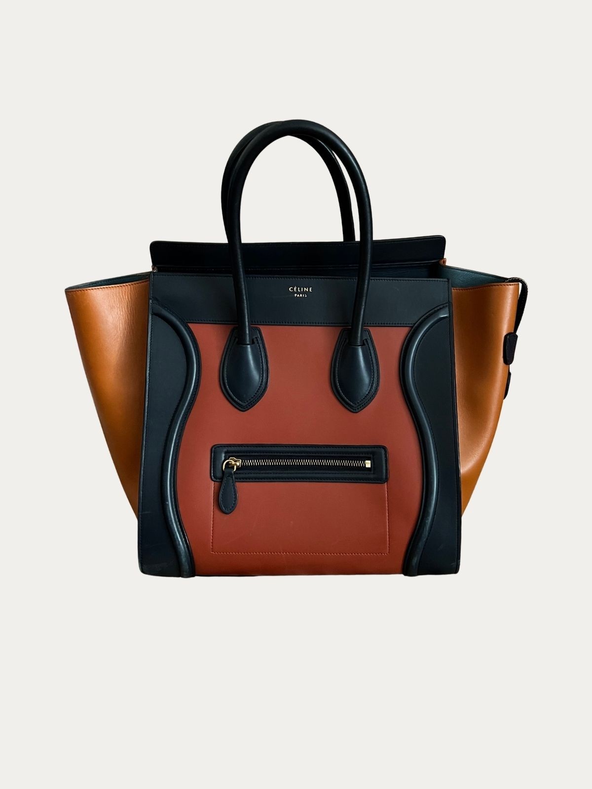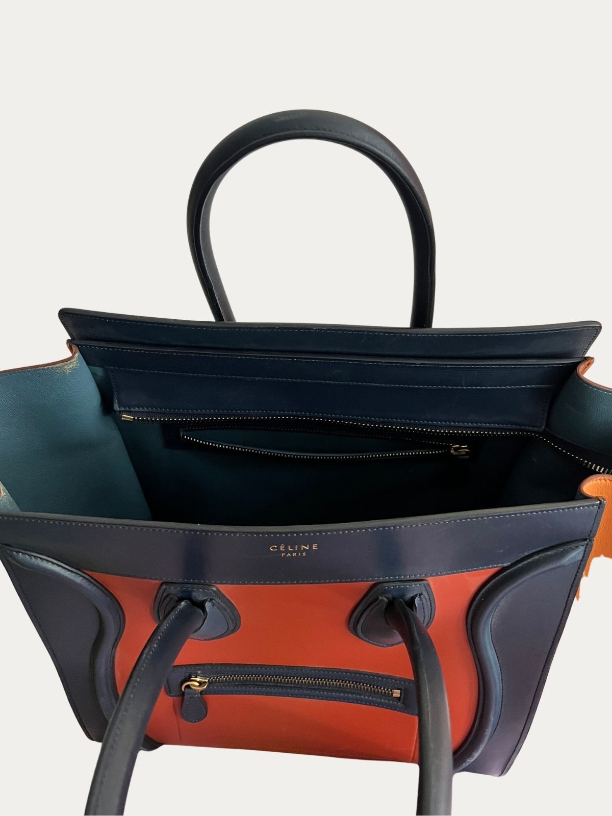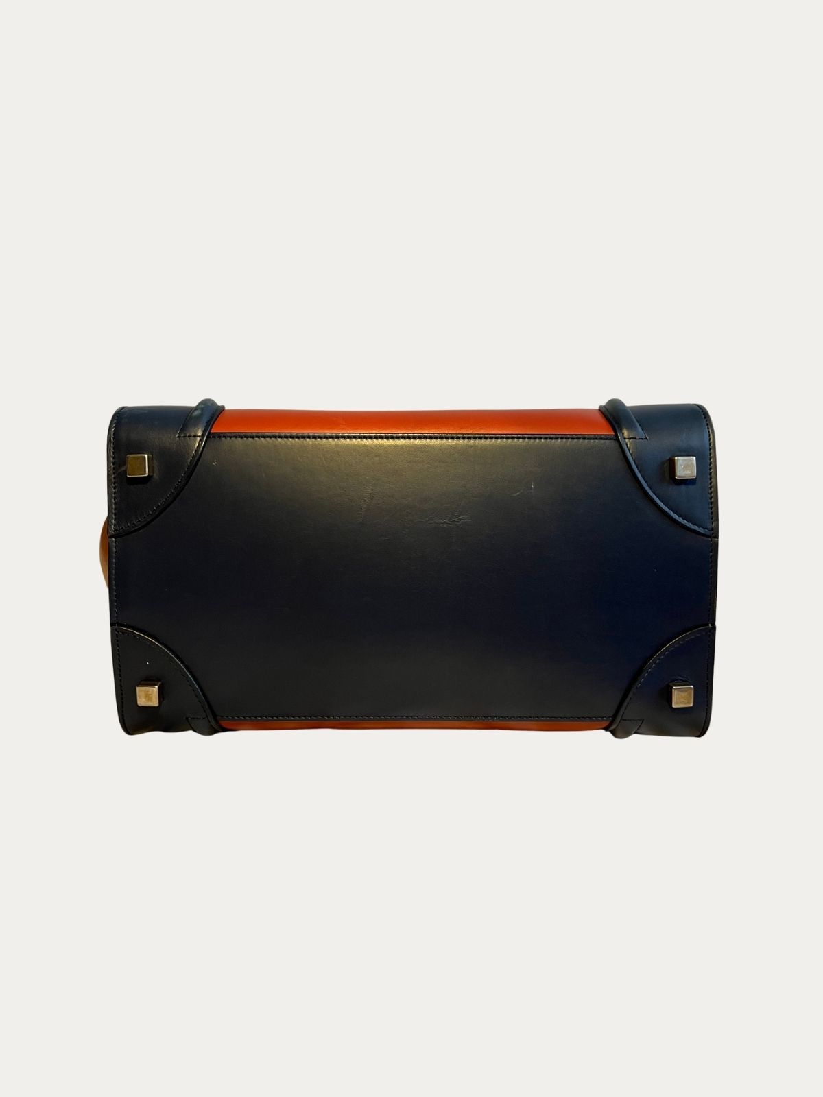 Celine Luggage torba, narandžasta sa tamno plavim detaljima. Nošena, u vrlo dobrom stanju. Serijski broj: F-CE-0164. Dimenzije: 31x30x18cm.